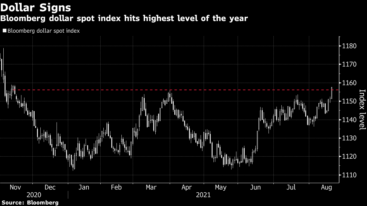 这种情况已经出现迹象。中国制造业采购经理人指数接近了危险的50水平,标志着扩张和收缩之间的差异,同时如上图所示,美元已经飙升至九个月来的高位,因为市场开始定价结束缩减购债和德尔塔变种的威胁。几乎没有迹象表明中国将对经济放缓做出大量新的刺激,这非常明显地暗示着未来的挑战。