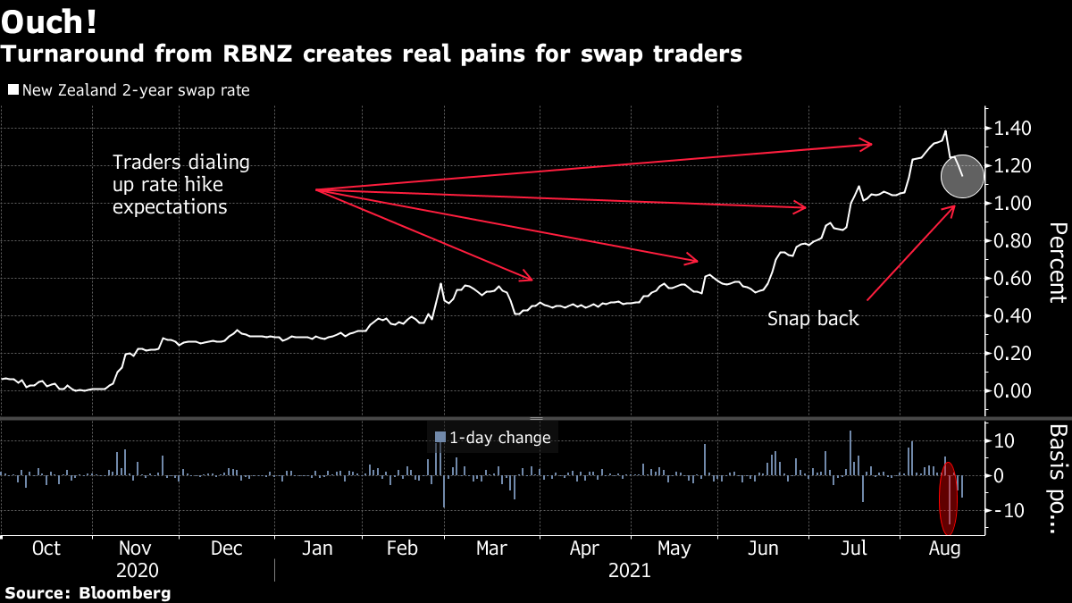 然后在周二,即中央银行会议前一天,消息传出:在该国最大城市奥克兰发现了一例新冠病例。正如我们现在所知,一个病例从来不只是一个病例。新西兰的10年期债券收益率下跌了10个基点,两年期利率互换 -- 用于押注借款利率的工具 -- 下跌幅度为2020年3月以来最大,因为交易员被迫解除对加息的押注。