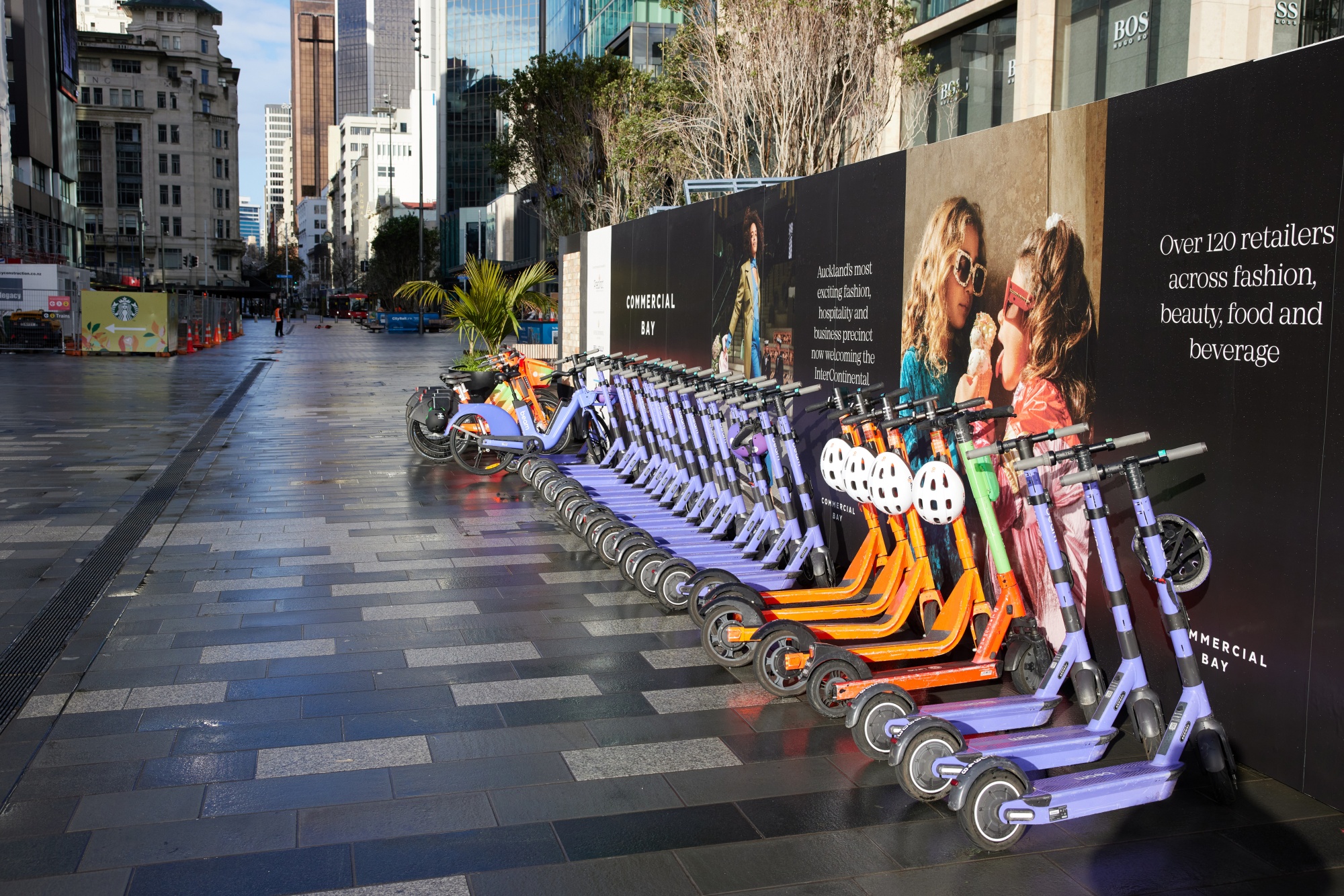 在2021年8月18日星期三的新西兰奥克兰市全国封锁期间,一排租用滑板车和自行车停放在一条空无一人的街道上。
