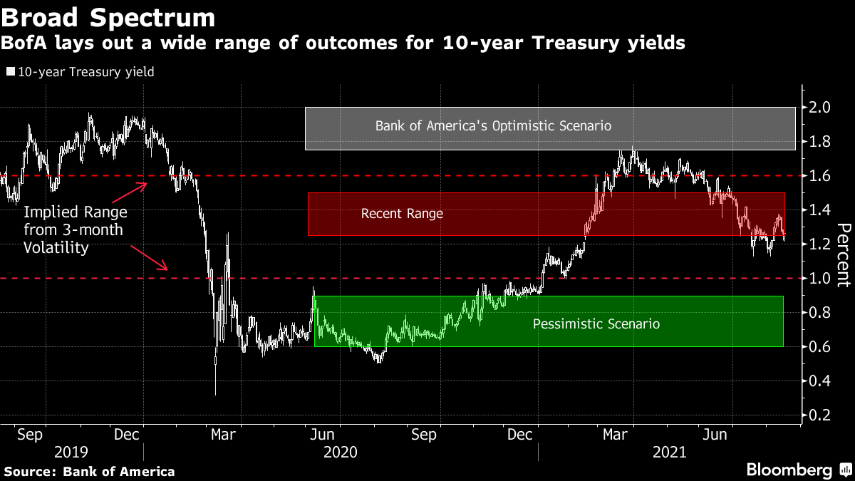 本周引起债券交易员注意的一件事是美国银行最新的国债预测,预计基准收益率将在年底之前下滑至1%以下,或者从当前水平约1.23%激增至2%。这是按照通常标准来说一个极其宽泛的范围。