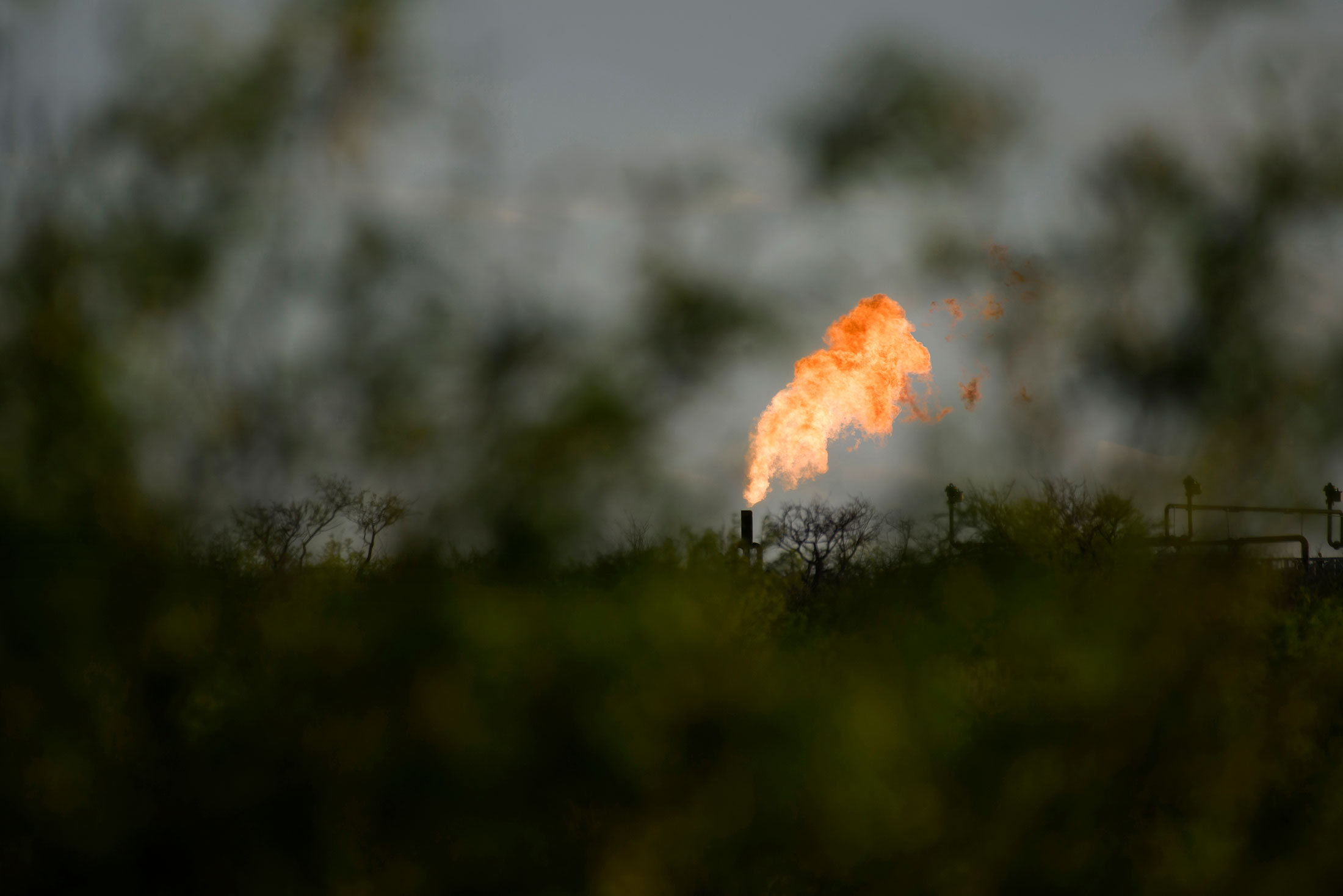 新墨西哥州利亚县的一个火焰喷射的天然气井。摄影师:Mark Felix/Bloomberg