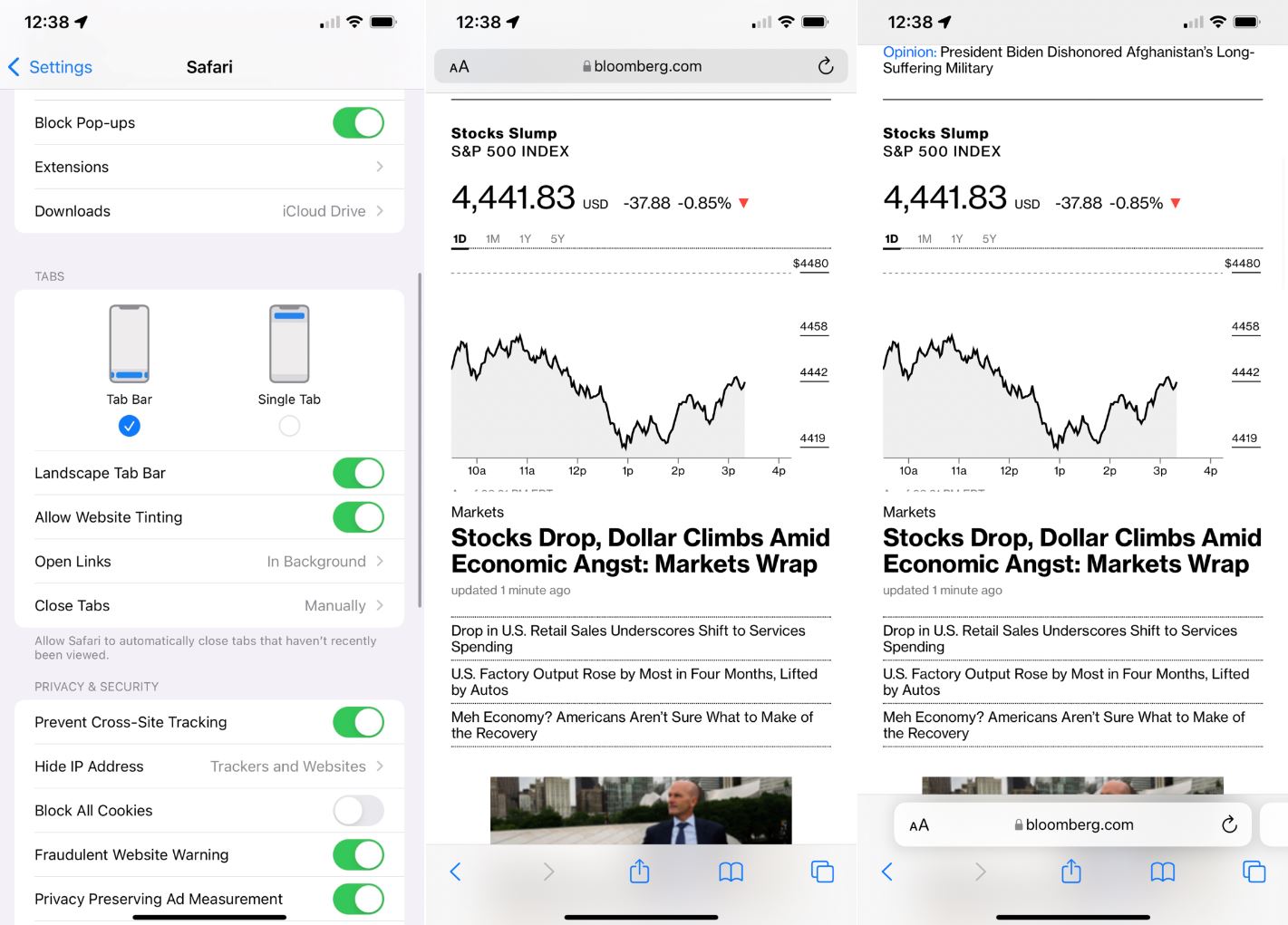 苹果新的iOS 15 Safari设置(左),旧界面(中)和现在可选的新界面(右)。图片来源:马克·古尔曼/彭博社我更喜欢地址栏在顶部,并已经在我的iPhone上恢复到了那个界面。在听取反馈意见后为用户提供这种选择是苹果一个罕见而积极的举措。