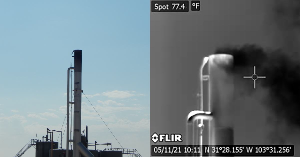 从得克萨斯州皮科斯北部的一口井中涌出的甲烷(左)通过特殊摄像头(右)拍摄。摄影师:Sharon Wilson### 明天你需要知道的事情