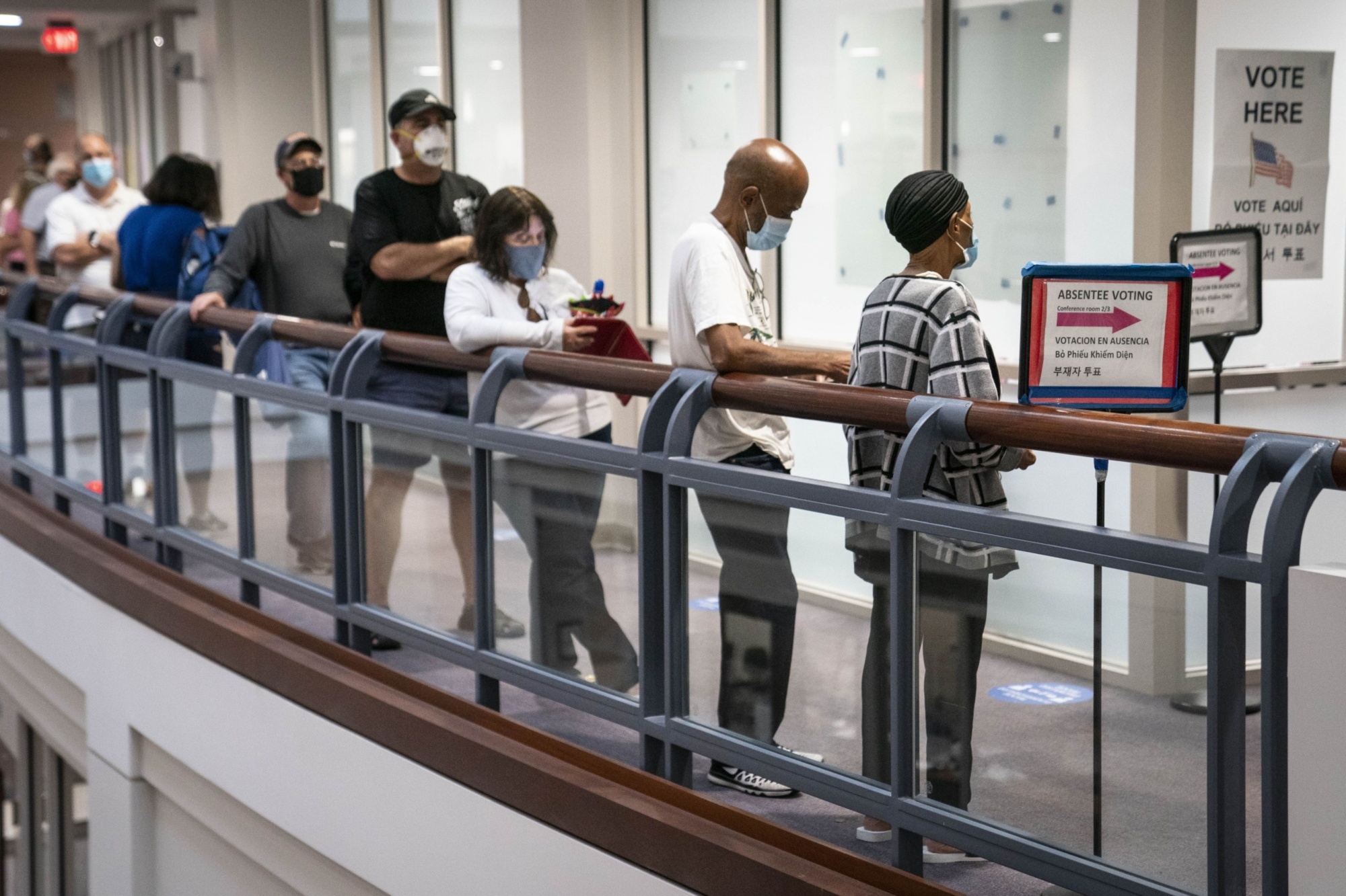 选民们在弗吉尼亚州费尔法克斯的一个提前投票站排队投票,时间是2020年9月18日。弗吉尼亚州成为今年第一个通过自己版本的联邦选举权法案的州。