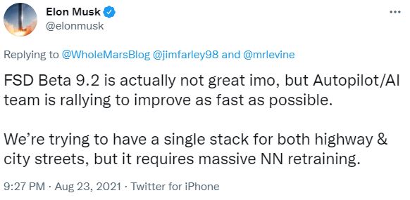 “FSD Beta 9.2 实际上我认为并不好,但自动驾驶/人工智能团队正在全力改进,”他写道。“我们正在尝试为高速公路和城市街道使用单一技术栈,但这需要大规模的[神经网络]重新训练。”