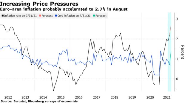 本月,欧元区通胀率达到2.7%,为2012年以来最快,这是经济学家的中位数预测,供应瓶颈和放松封锁措施推高了价格。与此同时,强劲的复苏可能已将失业率推至危机峰值以下整整一个百分点,去年失业率达到8.6%。