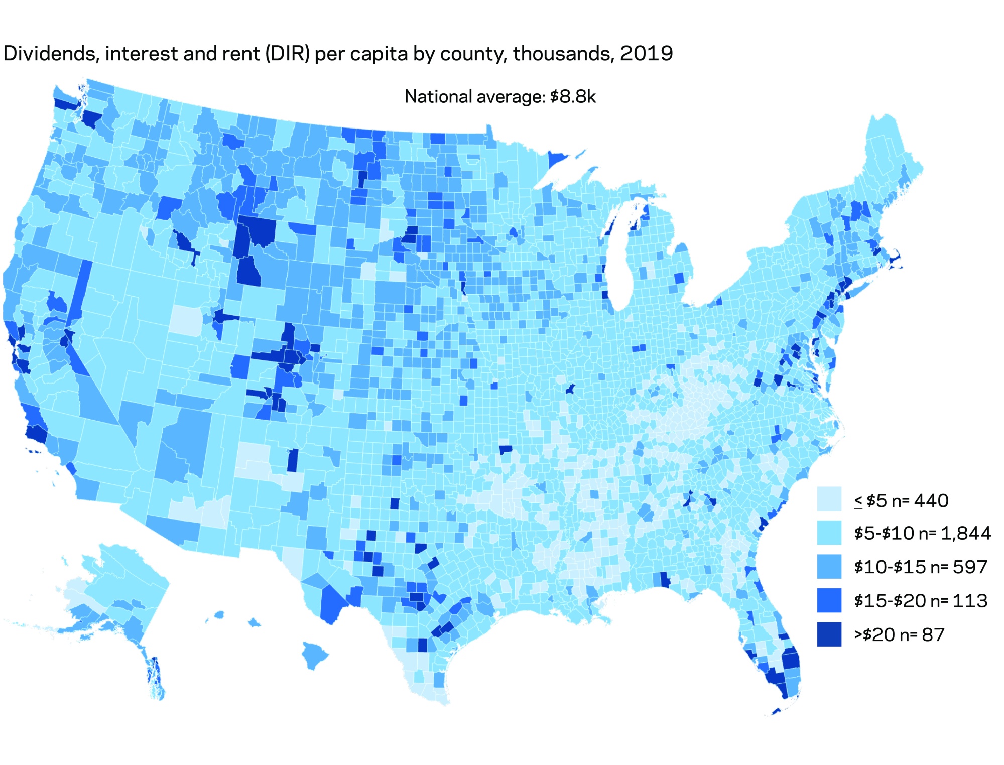 颜色越深,县人均资产越多。来源:经济创新集团基于资产的收入通常集中在金融、矿业、技术和休闲目的地的县。但在其余的县,这种收入却很少见。