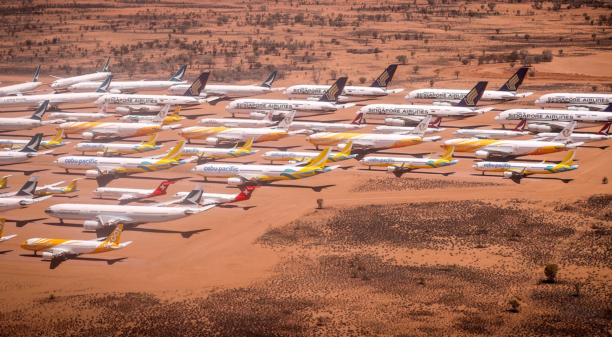 澳大利亚艾丽斯泉亚太飞机存储设施的沙漠停放着一支飞机舰队,已成为全球航空业受疫情影响的富有感染力的象征。