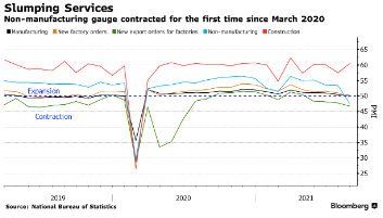 中国经济在8月份因德尔塔变种病毒爆发受到打击,服务业自去年2月以来首次出现收缩,制造业受到供应链问题的影响,迫使当局提供更多经济支持。