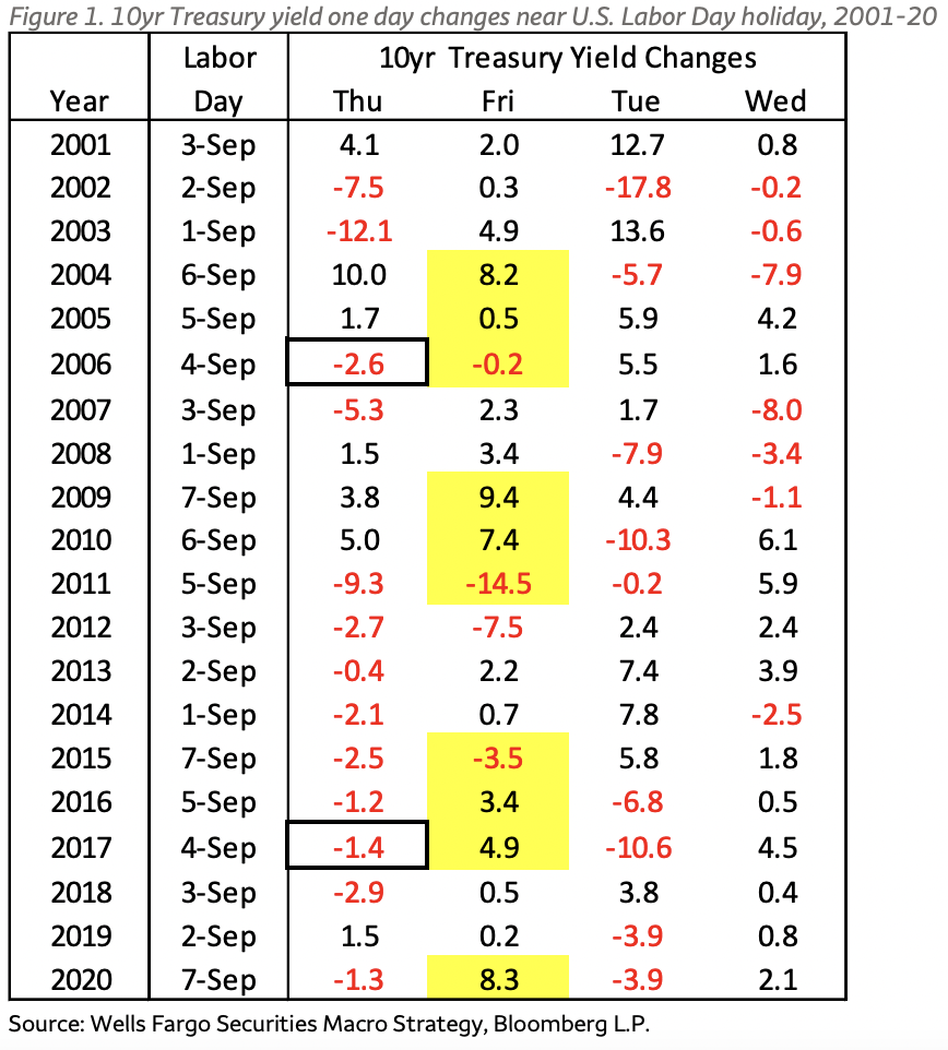 当然,额外的复杂性在于这个假日前的星期五还带来了8月的就业报告。 自2001年以来,这种情况在进入劳动节周末时大约有一半的时间发生过,而在这20年的时间跨度内的四次“异常”中,有三次与工资单打印有关,国债收益率在星期五下降。
