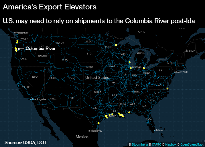 美国可能需要依赖铁路和驳船运输到哥伦比亚河(伊达飓风后,黄色为出口升降机,蓝色为主要铁路)美国粮食出口商可能正在努力弄清楚是等待飓风“伊达”后的航运延误是否值得,还是使用铁路运输将粮食运往美国各地较少使用的升降机,特别是在太平洋西北地区。