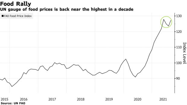 这加剧了今年食品供应链面临的一系列问题 — 从极端天气破坏作物到运费飙升和瓶颈。所有这些都威胁着通胀的加剧。根据联合国的数据,全球食品价格在本周重新开始攀升,接近十年来的最高水平。
