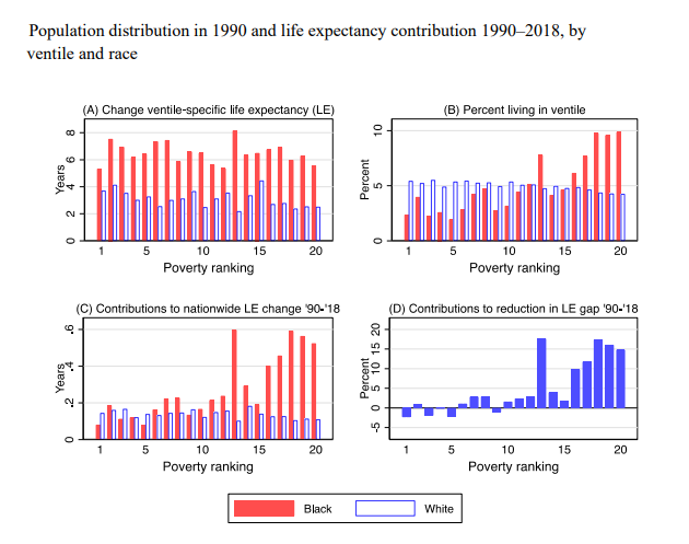 尽管黑人和白人美国人的寿命预期存在较大差距,但在1990年至2018年间,这一差距减少了48.9%,主要是由于黑人美国人的死亡率下降。
