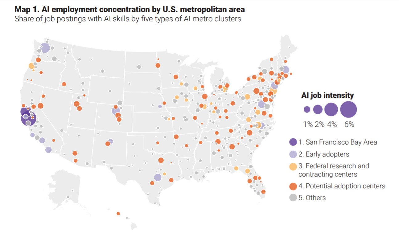 总的来说,根据这项研究,美国仅有10%的都会地区——共36个——具有重要的人工智能存在。下面的地图来自该研究,标识了五个关键类别的人工智能城市和都会地区。