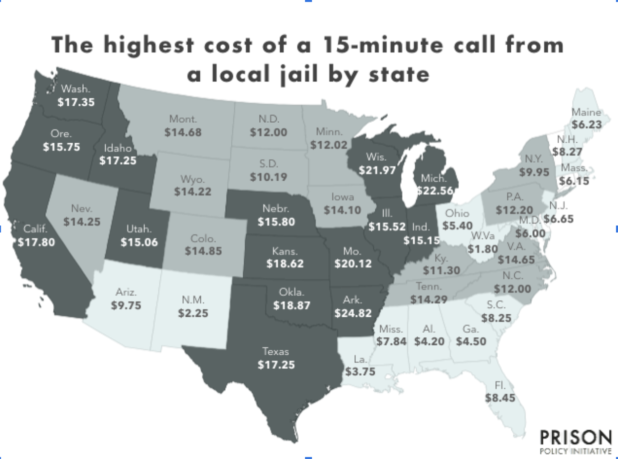 然而,在大多数地方和县级设施中,通话费用仍然很高,同一州内的通话不受联邦监管。这种州内通话占囚犯通信的80%以上,在各州之间差异很大,各州被允许自行协商费率。2019年的一份监狱政策倡议报告发现,在美国超过一半的州,州内15分钟通话的最高费用可以超过10美元,在15个州超过15美元。