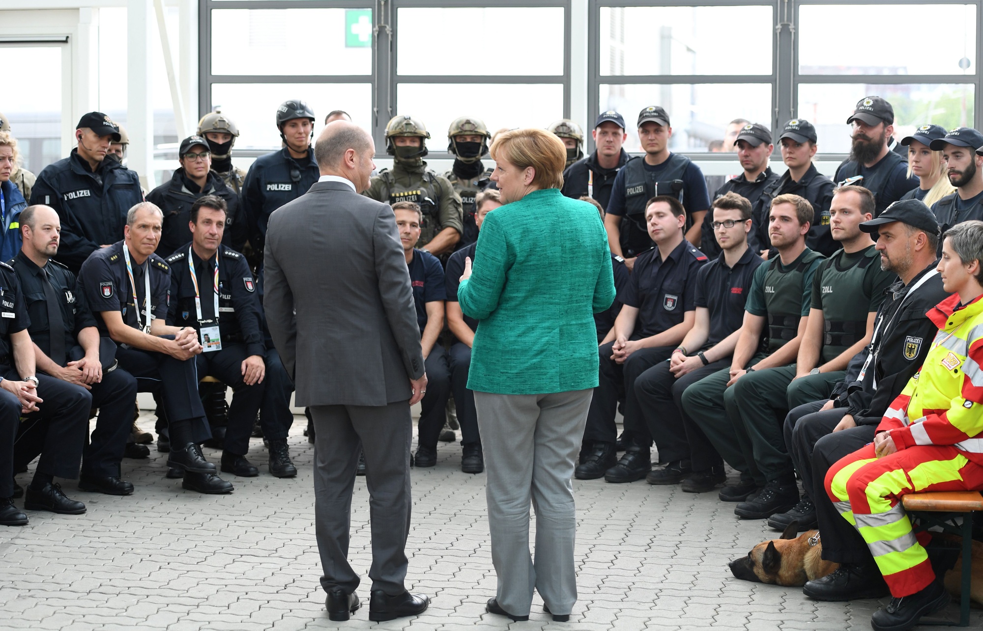 施尔茨和安格拉·默克尔在2017年7月8日汉堡G20峰会期间与警察和消防人员交谈。摄影师:帕特里克·斯托拉兹/法新社/盖蒂图片社在会议之前对安全担忧置之不理,施尔茨受到了批评,但最终他渡过了难关,部分原因是默克尔的保护之手。