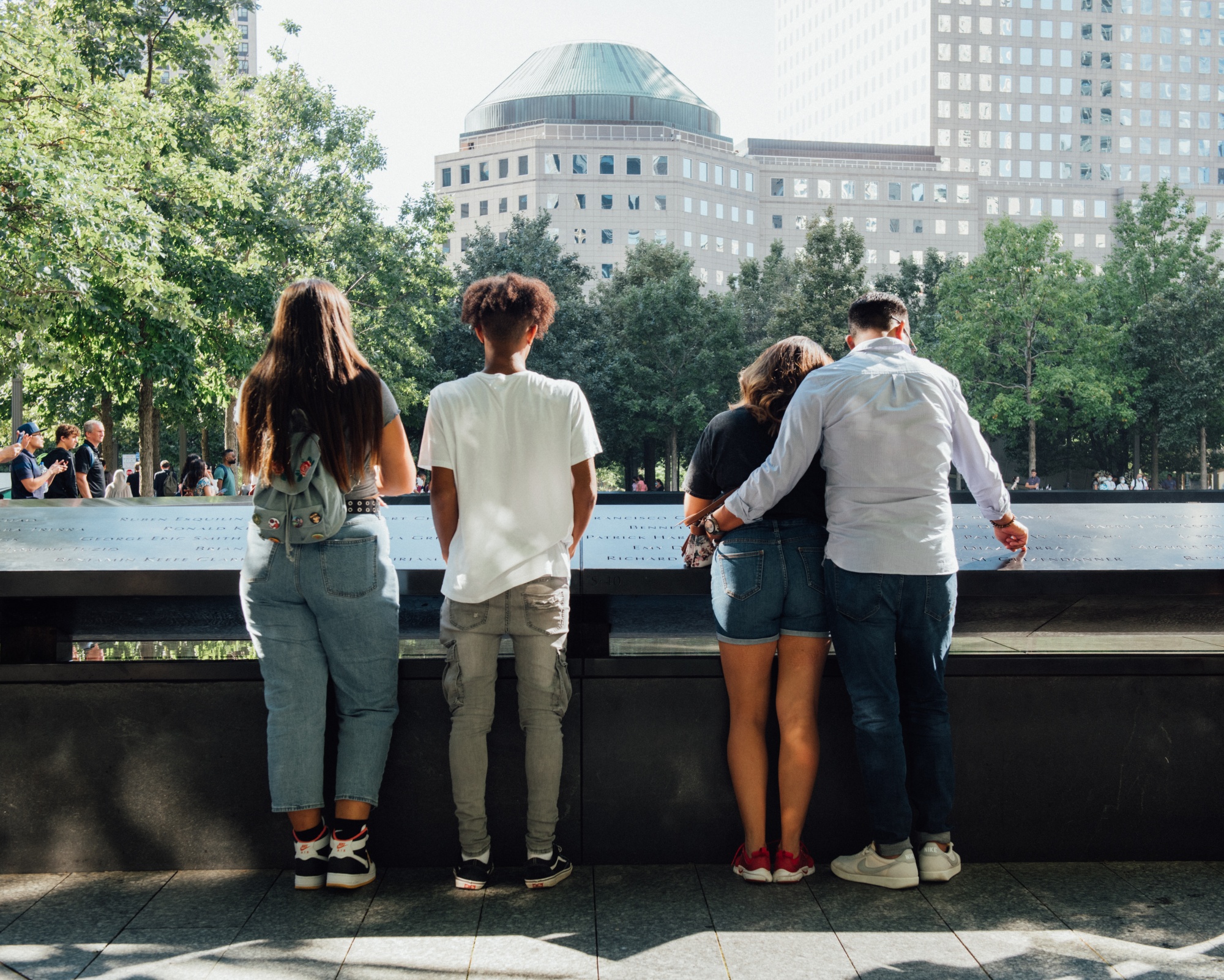 2001年和1993年恐怖袭击中遇难者的名字刻在纪念池边的青铜护栏上。纪念池位于前北塔和南塔的遗址上。摄影师:乔治·埃瑟里奇/彭博社“大多数孩子说他们想成为消防员、警察或者赛车手,”坎德拉说。“但我想做我爸爸做的事情。”