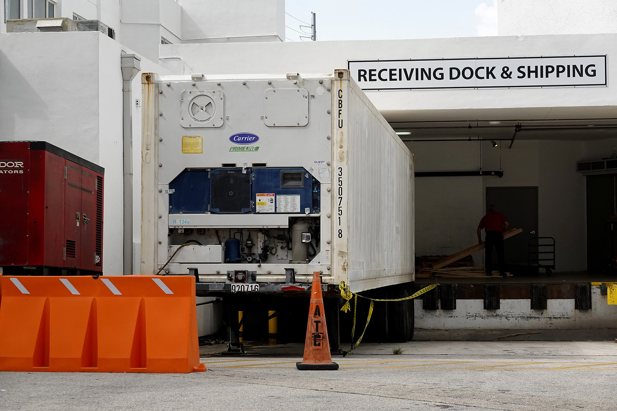 在佛罗里达州北迈阿密海滩的杰克逊北医院停放着一个用来存放新冠肺炎患者尸体的冷藏拖车,拍摄于9月1日。