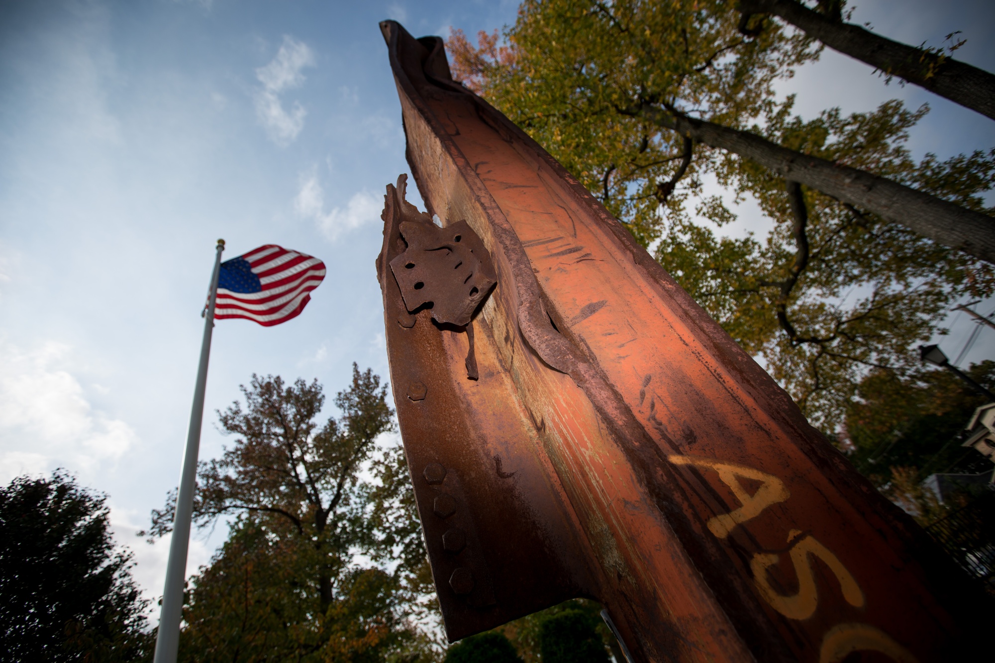 在新泽西州福特李的宪法公园,一面美国国旗飘扬在世界贸易中心的钢铁背后 — 这是美国各地纪念9/11袭击的许多地方之一。