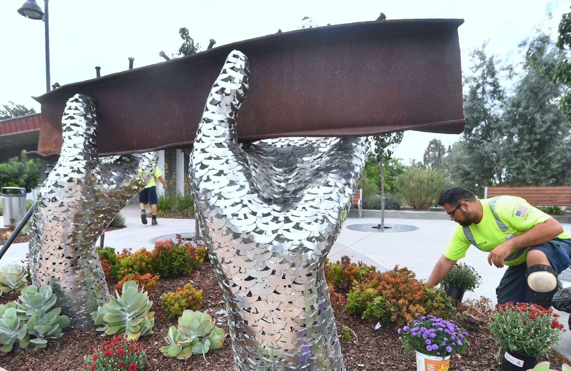加利福尼亚州罗斯米德的艺术家希思·萨托创作的世界贸易中心纪念碑。这座雕塑包含2976只不锈钢鸽子,代表2001年袭击的受害者,它们被焊接在一起,形成一对巨大的手从双塔中抬起一根扭曲的钢梁。摄影师:弗雷德里克·J·布朗/法新社通过盖蒂图片社这些I形梁和烧焦钢铁的大部分块块被用来建造遍布全国的小型9/11纪念碑。他们写道:“只有少数美国纪念碑位于主要城市。”“大多数纪念碑建在郊区办公园区和停车场之间的边缘空间,交通环岛的中心,小镇公共建筑外面。”