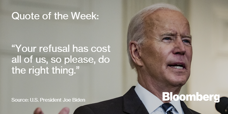 9/11一代:追随失去父母的人走上华尔街在袭击中失去父母的孩子们现在已经长大,追逐他们自己的梦想。 Mary Biekert 写道,几十个孩子发誓要像他们曾经失去的父母一样,为纽约效力,成为消防员或警察。还有一些人 追随 他们失去的人踏上华尔街 — 有些甚至进入了同一家投资公司。拜登下令为数百万人接种疫苗,称未接种疫苗者是威胁拜登表示,他正在下令数百万行政部门雇员、联邦承包商和医护人员接种新冠病毒 疫苗。 Josh Wingrove 和 Jenny Leonard 撰写称,他批评了决定不接种疫苗的美国成年人中的25%,称他们正在拖延这场已经夺走美国超过65万人生命的大流行病。
