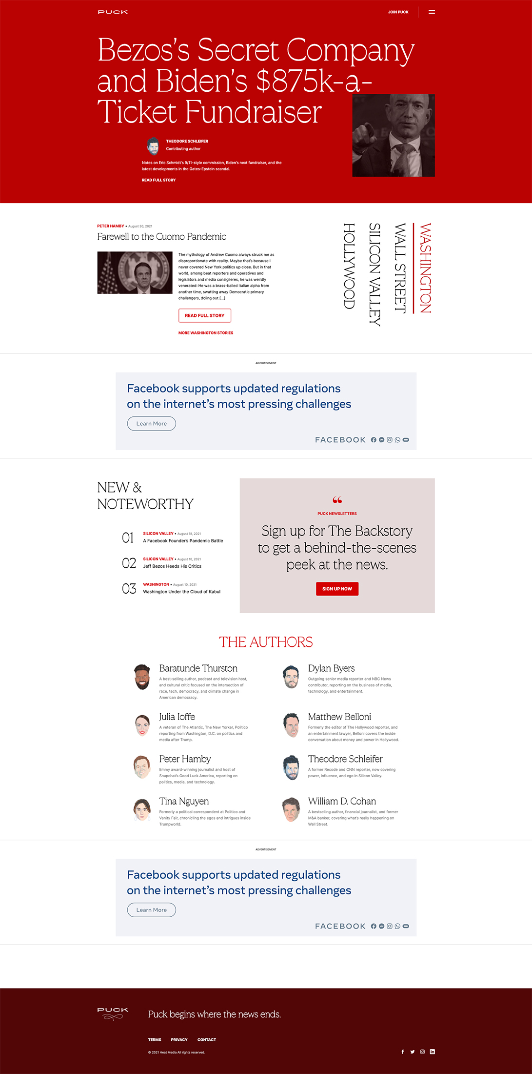 Puck搭起了这两个世界之间的桥梁,创造了一个新闻机构的基础设施,同时将其品牌融入到像Belloni或Ioffe这样的个人作家中。每位创始合伙人都拥有公司的一部分股份,并根据他们产生的订阅和广告销售数量获得奖金。每年100美元的费用使订阅者能够收到作者的个人电子邮件以及所有的新闻简报、特稿和突发新闻;250美元的费用还包括所有这些,以及与作者的电话会议、与工作人员的问答以及活动邀请。