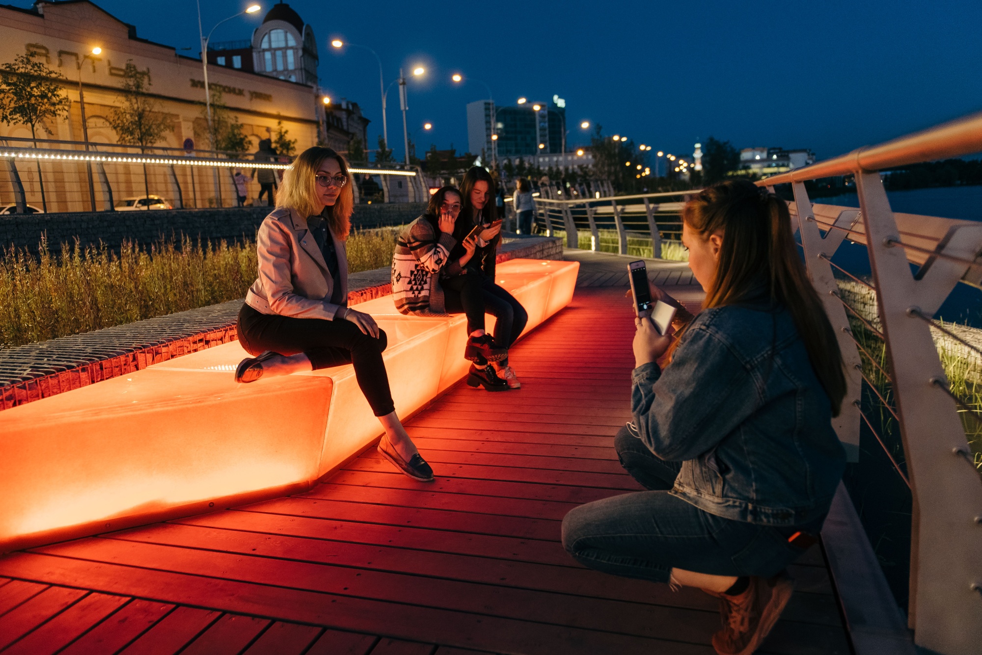新的步行道环绕着喀山的卡班湖,设有照明长椅。