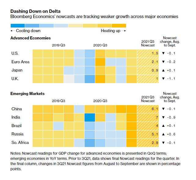 这是彭博经济学最新的Nowcasts显示的要点,最新的经济数据显示,从美国到中国再到德国,随着德尔塔变种的出现,经济增长放缓和持续通货膨胀的迹象正在显现。