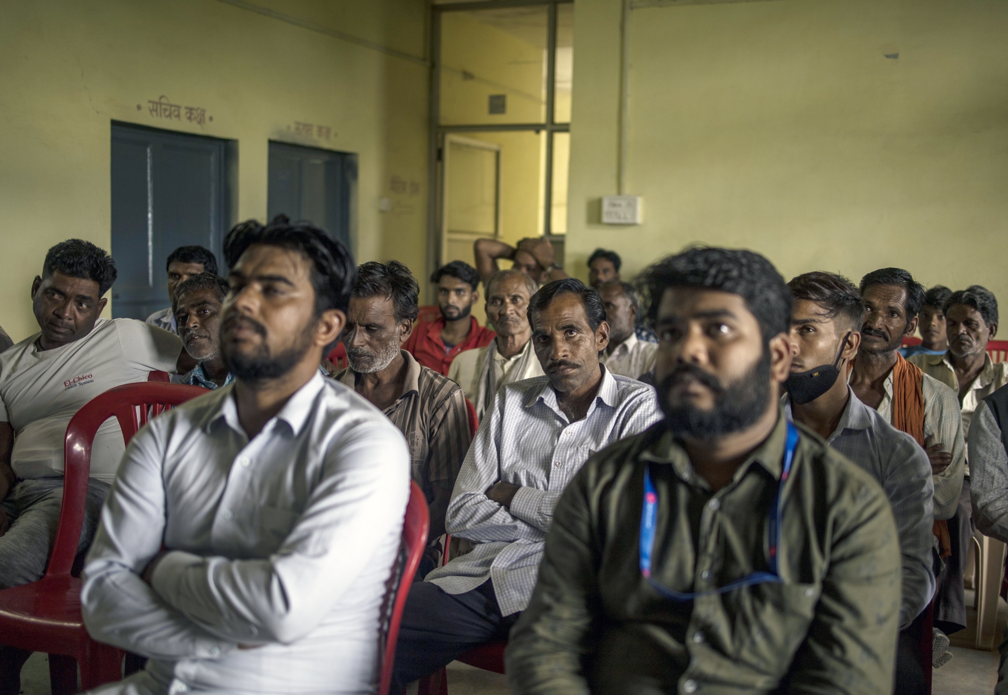 农民观看一场宣扬利用技术提高生产力的演示,地点在古纳。摄影师:Anindito Mukherjee/Bloomberg
