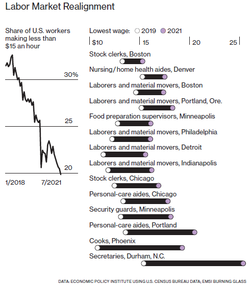 事实证明这可能并不那么重要。工人严重短缺 — 7月份的职位空缺数量超过新招聘人数430万,是2000年以来最多的 — 正在帮助最低层收入者获得显著的工资增长,Mike Sasso报道。阅读完整故事请点击 这里。