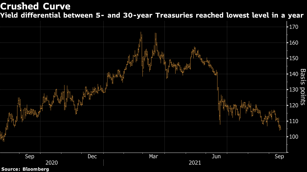 长期国债供需形势有利。9月份30年期债券拍卖对投资者如此诱人,以至于经销商所占份额创下有史以来最低纪录(13.1%)。本周没有国债优惠券拍卖,而总统乔·拜登寻求的3.5万亿美元的税收和支出计划的立法进展停滞,平息了对长期供应前景的担忧。