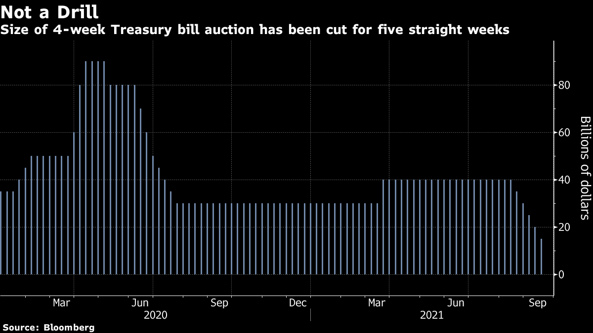 财政部一直在削减一些账单拍卖的规模,以防止触及债务上限。为期四周的账单遭受了最严重的削减,连续五周每周减少50亿美元。