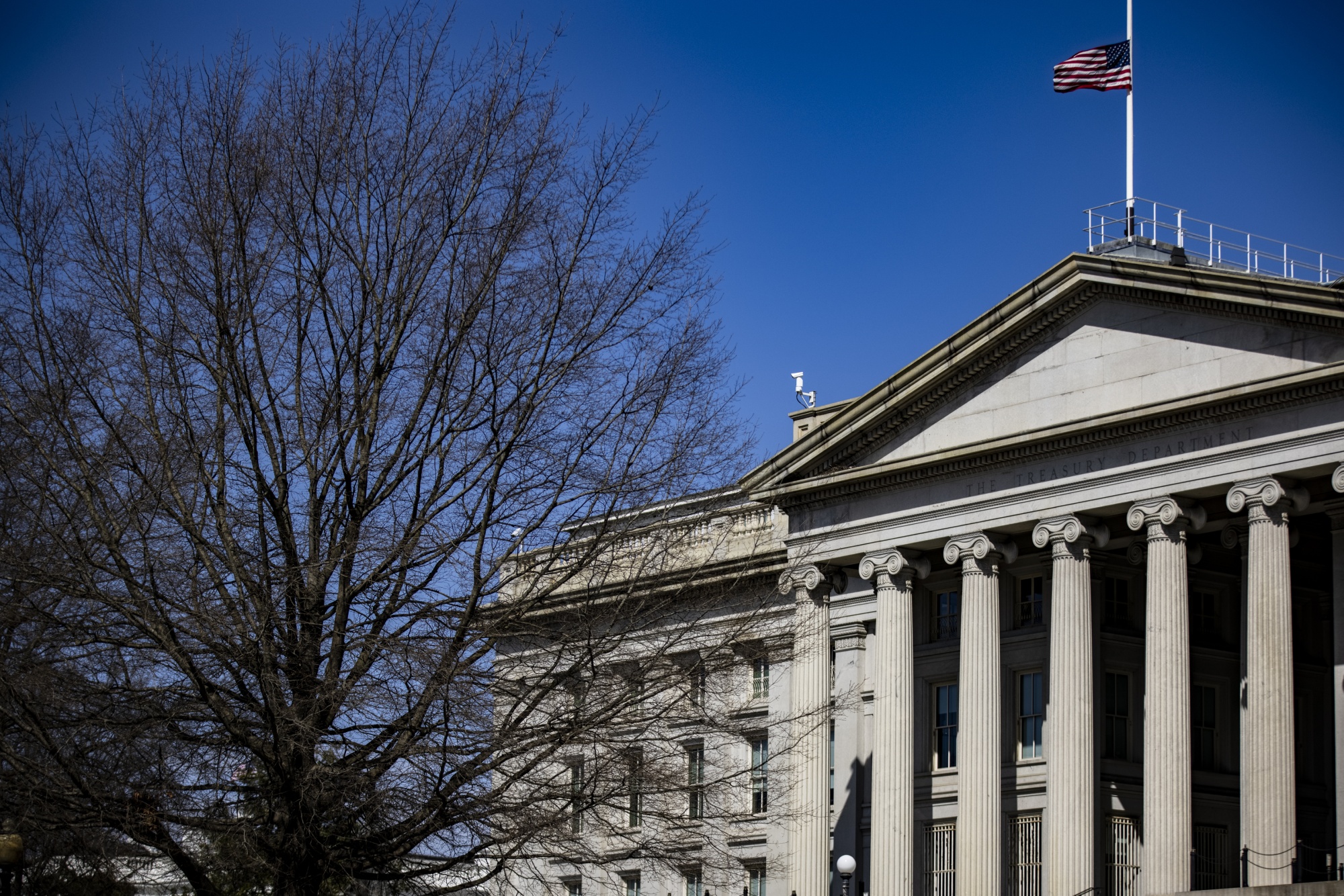 美国国旗在华盛顿特区美国财政部大楼外降半旗。