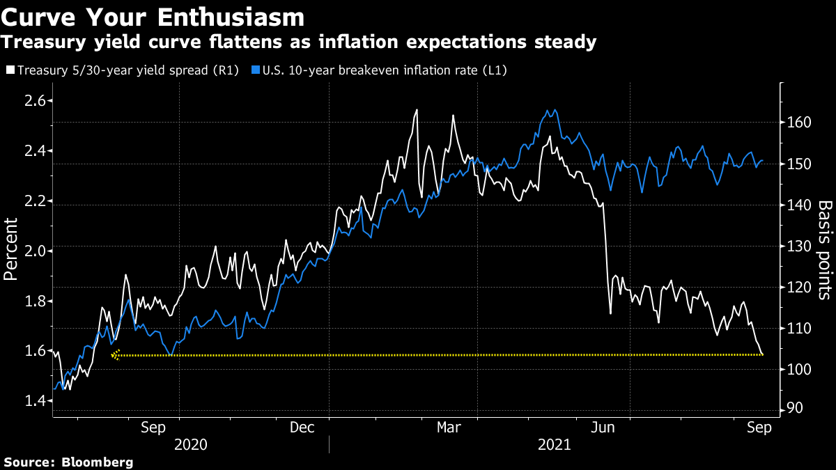 一些市场策略师认为收益率将上升至2%。但是快速查看收益率曲线必须对这些预测提出质疑。五年期和三十年期国债之间的利差已经收窄至一年多来的最低水平,因为通胀预期的上升已经消退。这表明债券市场并不担心最近能源价格的上涨,也不担心无序缩减的风险。本周延迟预期的美联储缩减公告仍然有可能,收益率可能会漂移至甚至低于共识预测,年底还有不到三个月的时间。