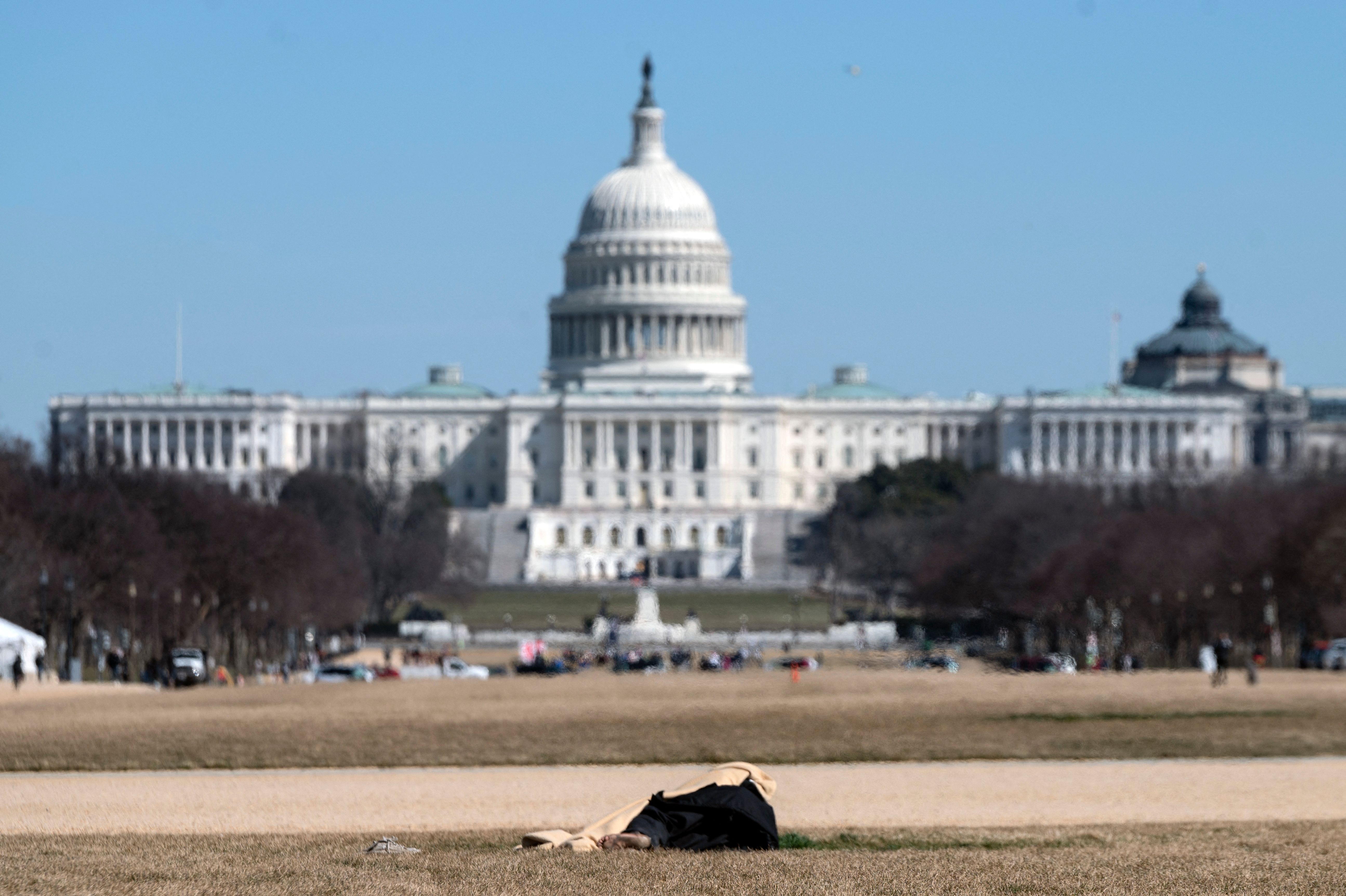 一个无家可归的男子在2021年3月在华盛顿特区的美国国家广场附近睡觉。