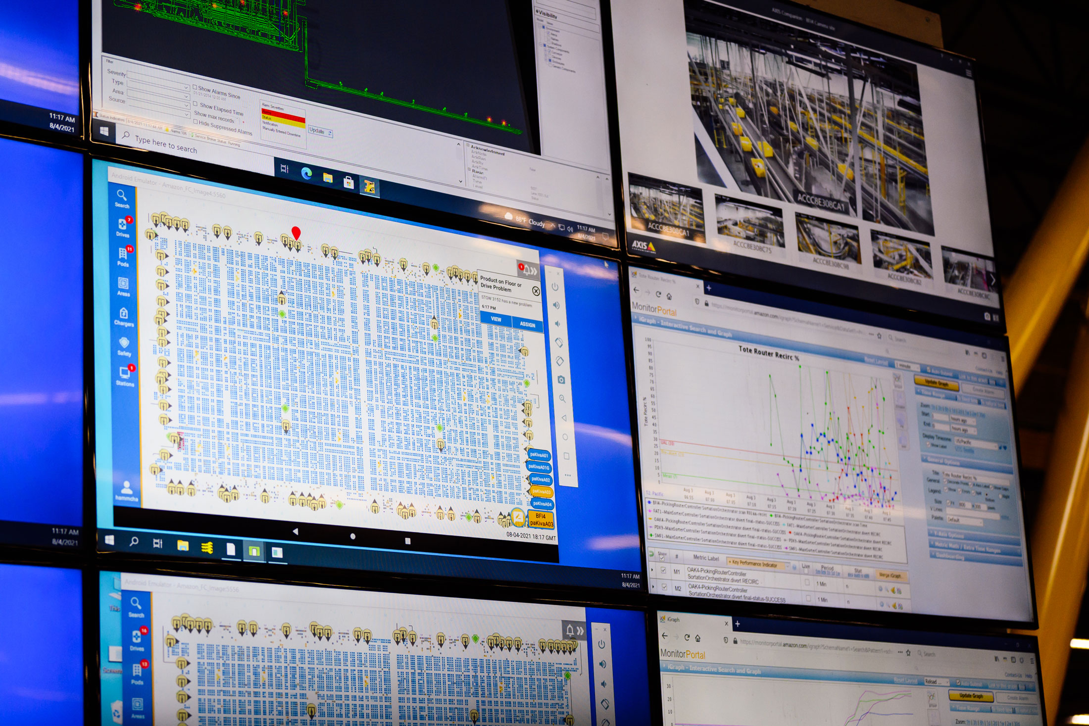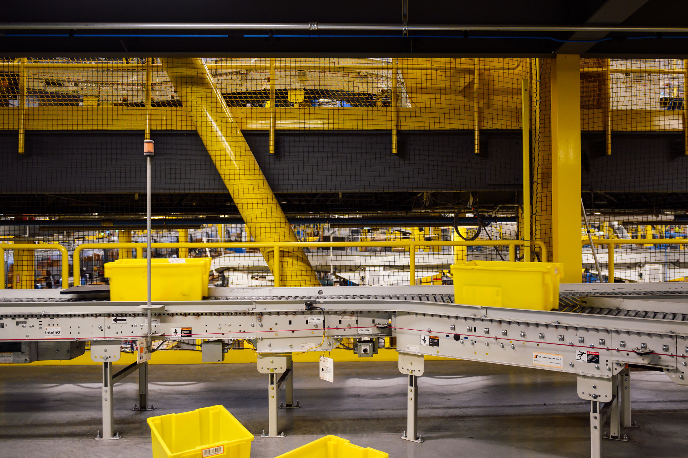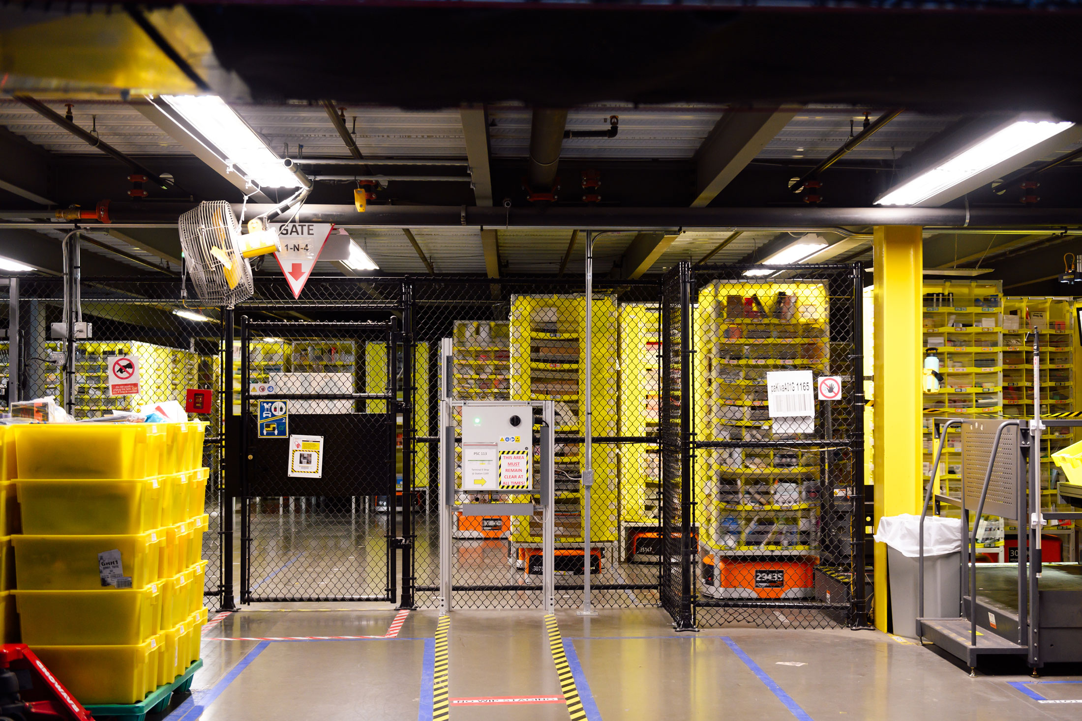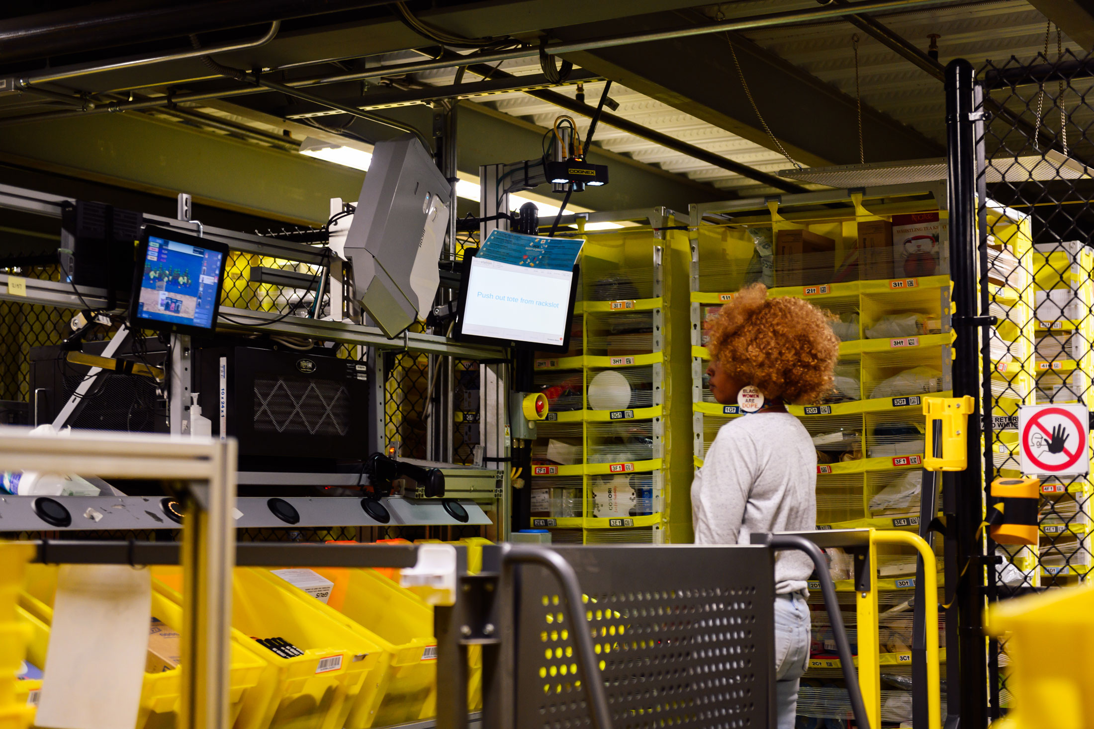 2012年,该公司收购了位于马萨诸塞州北雷丁的机器人制造商Kiva Systems。在那之前,工人们在仓库过道上走动,从高高的货架上取出产品,有时甚至使用打印出来的清单来找到特定产品。亚马逊希望使用Kiva机器人将产品货架送到等待的员工面前,这需要对其配送中心进行全面重新设计。BFI4于2016年开业,是最早为这些小型机器人而建的设施之一。它就像一个巨大的装配线,其3500名工人和110名薪酬管理人员在亚马逊精确的生产力跟踪系统的监督下工作。工人们将移动式传送带推到运送库存的卡车后面,然后按托盘或箱子将产品投入系统,该系统会自动扫描进货物品,将其列出在Amazon.com上进行销售,并触发向供应商付款。然后,工人们将物品存放在货架上,站在将他们与机器人隔开的铁丝网围栏旁。货架被紧密地打包在仅供机器人使用的区域内,直到下订单后,Kiva将货架驱动到拣选站,工人们取出正确的产品,放入箱子,然后送到装箱和发货的流水线上。