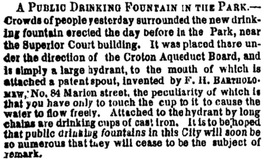 城市饮水泉的现代时代同样得到了慈善家的支持:一位私人捐助者于1859年在伦敦资助了一个公共饮水泉,旨在对抗霍乱等水传播疾病的传播。纽约市在同一年在市政厅公园建立了第一个公共饮水泉,引发了《纽约时报》的一篇报道:“希望这座城市的公共饮水泉很快会变得如此之多,以至于它们不再成为人们关注的焦点。”