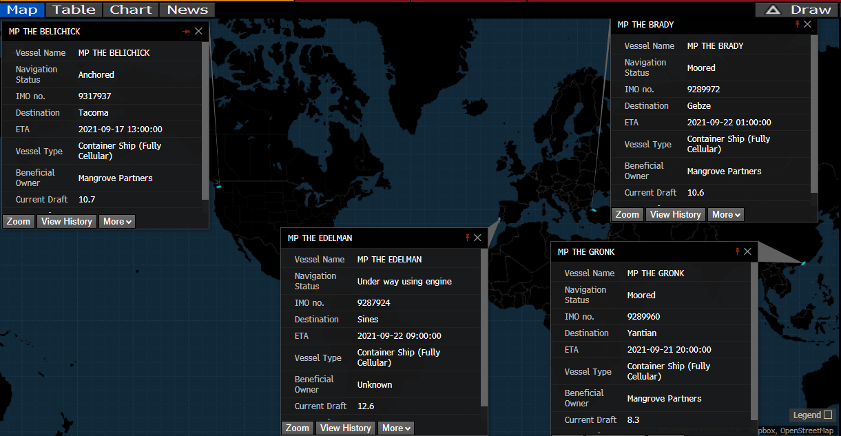 根据彭博社的映射功能,The Brady 目前停泊在土耳其,The Edelman 正在驶往葡萄牙的航线上,The Belichick 在西雅图附近静止不动。从澳大利亚出发,The Gronk 停泊在香港附近。
