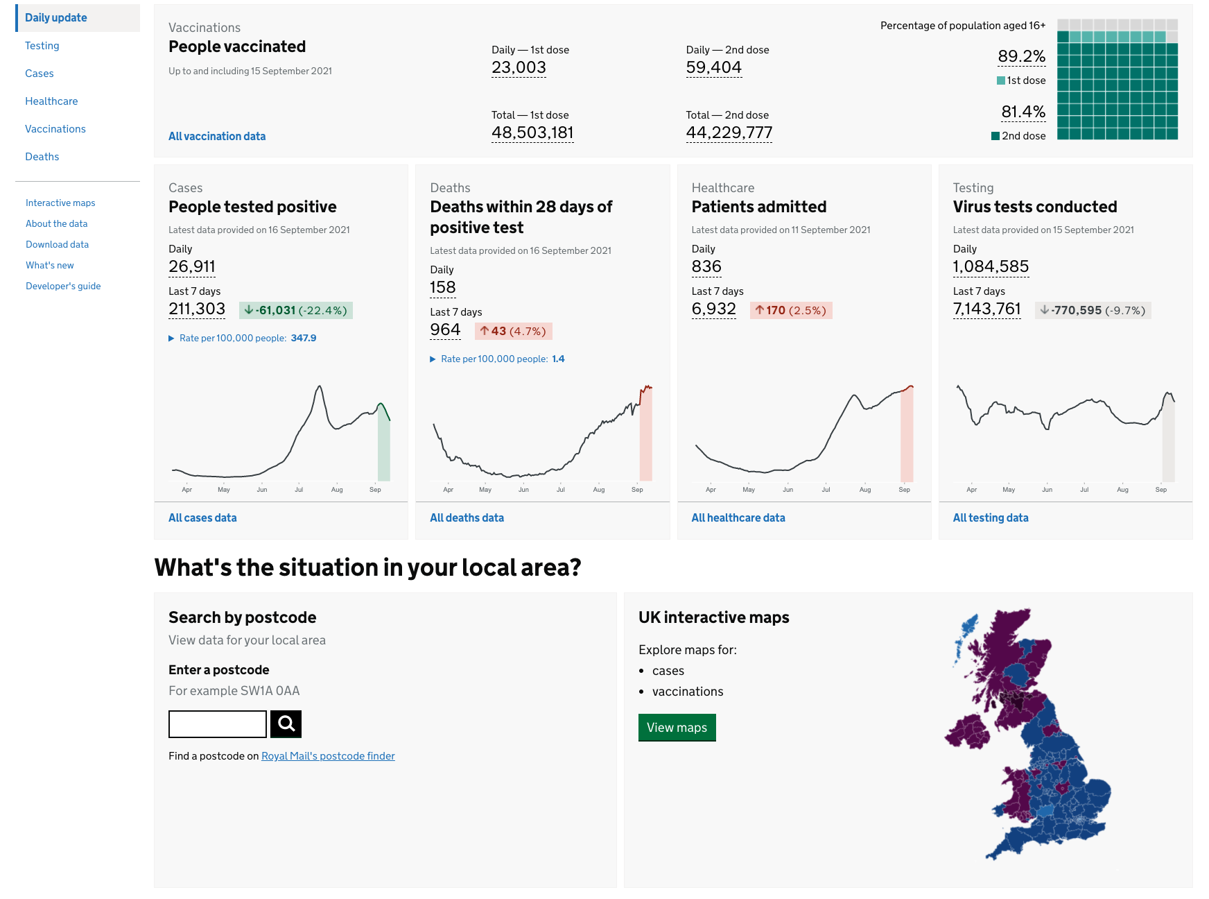PHE新冠肺炎仪表板提供了英格兰国家的疫苗接种、病例和死亡数据,也包括整个英国的数据。因此,它拥有其他较小的公共卫生机构可能缺乏的资源。最初是一个三人团队,现在有17人在新冠肺炎仪表板上工作(并非全职)。这个仪表板自问世以来已经经历了11次重新设计,从最初的几个折线图发展成了一个完整的数据中心,其中包括一个交互地图,用户可以在其中搜索其邮政编码区域的病例和疫苗接种数量。