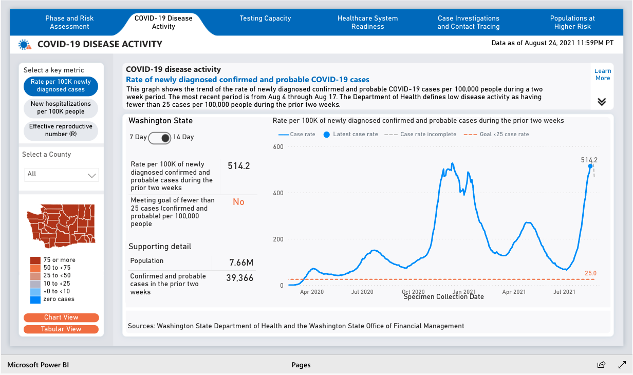 总部位于西雅图的公司在大流行开始时派遣数据分析师帮助华盛顿州卫生部门。“我们在全国范围内提供咨询帮助,实际上,遍布全球。这不仅仅是可视化,还包括解释和理解,”Kahan说。结果是:华盛顿州的Covid-19仪表板运行在Power BI上。