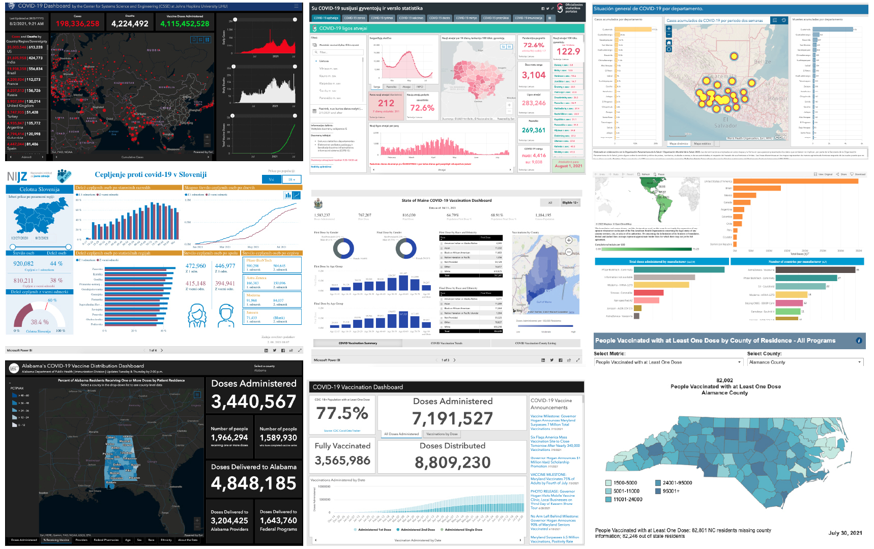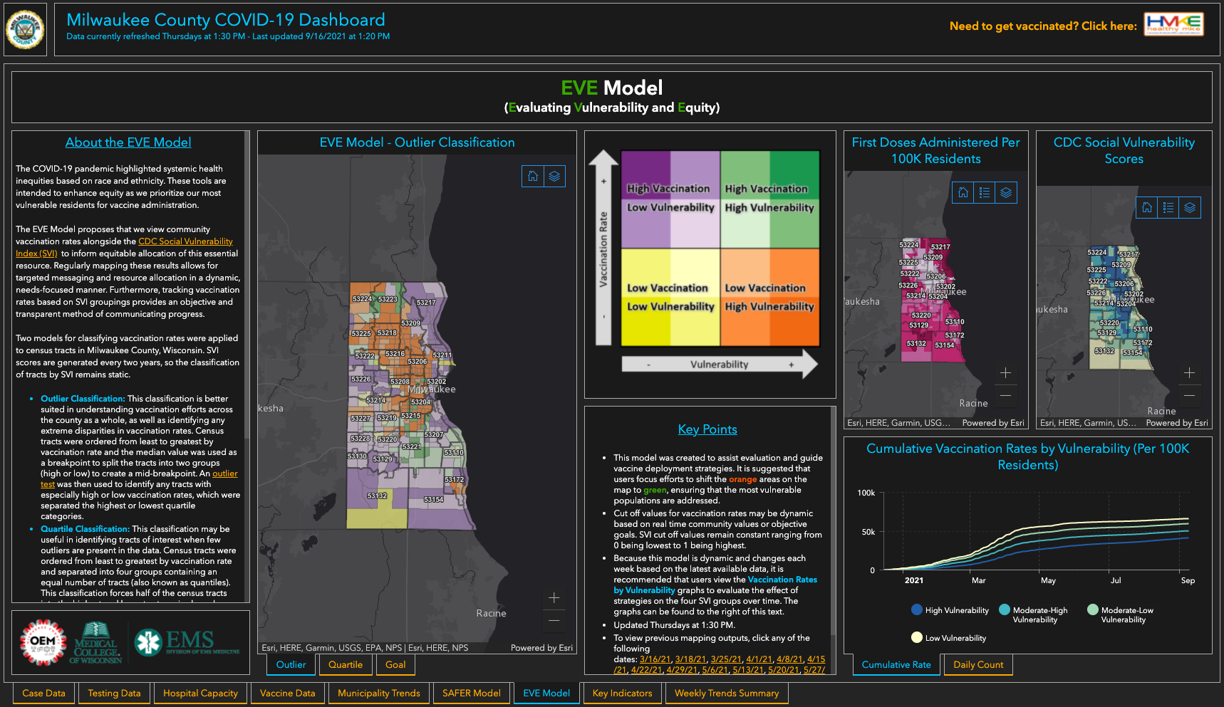 最早提供种族和族裔数据的县之一是威斯康星州密尔沃基县。2020年3月,其仪表板只是一个地图和几个图形,由其紧急管理办公室的两名分析师在一周内使用Esri制作。随着时间的推移,该仪表板已经成为一个包含两个内部开发的流行病学模型的数据中心。它已被公共卫生部门、学校董事会成员和公共卫生官员用于决定在何处设立检测和接种疫苗点。