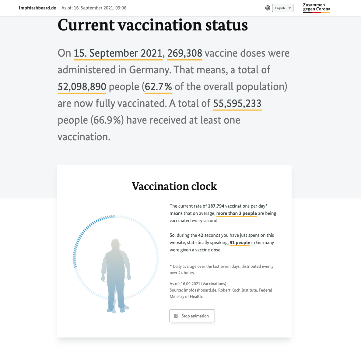 在德国,自由职业平面设计师Moritz Stefaner和他的同事Stephan Thiel设计了该国官方的Covid疫苗仪表板,与罗伯特·科赫研究所合作。 Covid病例和死亡仪表板仍然依赖Esri及其非常引人注目的黑色背景、大数字和多个切换按钮。