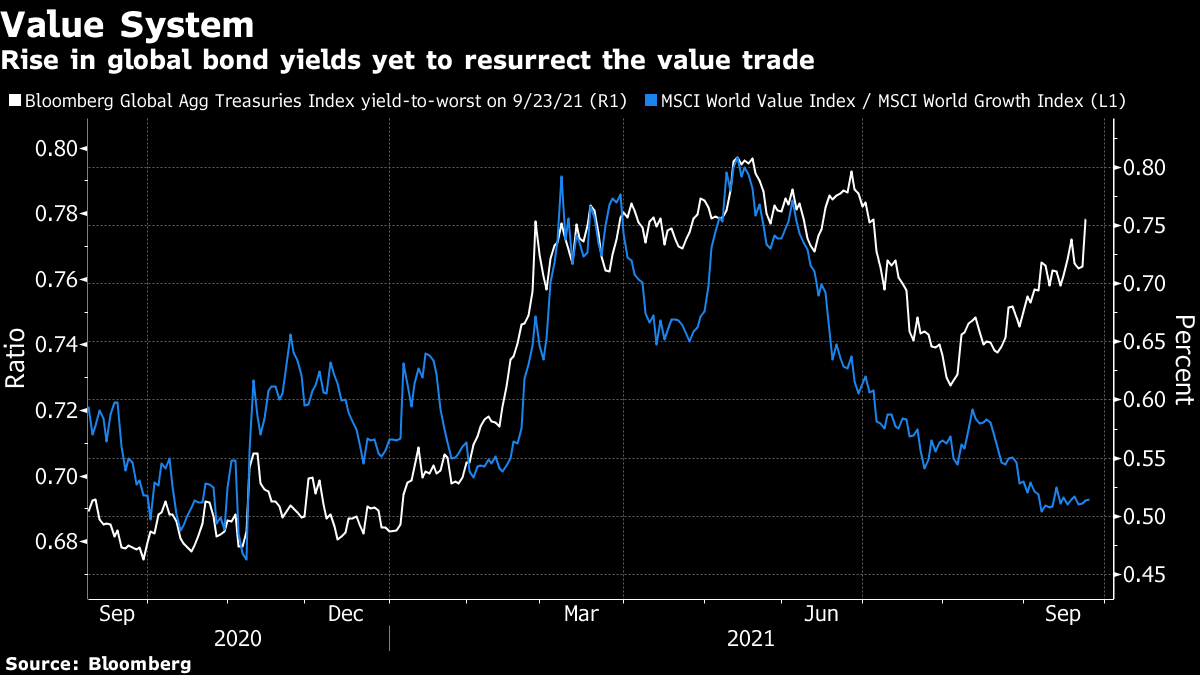 对于那些缓慢学习的人来说,周四的缩减恐慌可能再次推高全球债券收益率,但也再次凸显了全球价值股的表现不佳。彭博全球综合国债指数的最差收益率跃升至七个月来的最高水平,但MSCI世界价值指数仍然接近11个月来相对低位,与其增长对手相比。