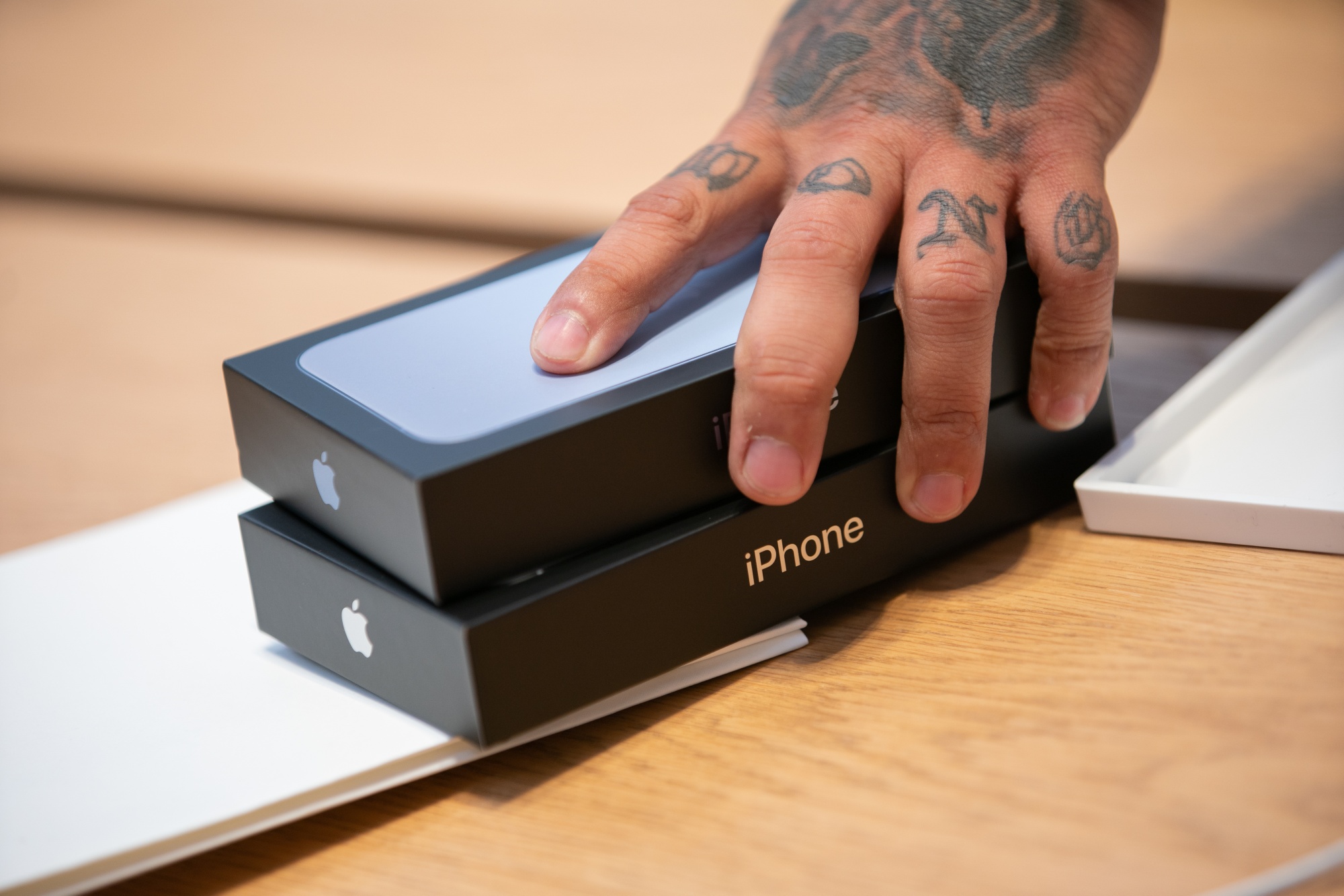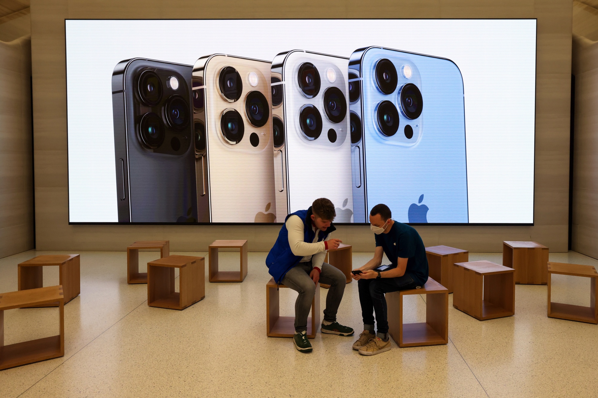 一名员工在伦敦的苹果商店为顾客提供服务,日期为9月24日。