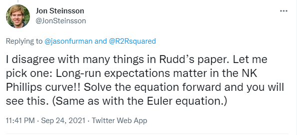 但这正是上周五发生的事情,尽管发生在华尔街和学术经济学家所在的Twitter角落。杰里米·鲁德(Jeremy Rudd)的27页论文关于通胀预期重要性的论文引起了关注,并因两个原因引发了讨论。首先,他在脚注中指出“担心主流经济学在我们社会中的主要作用是为一种犯罪性的压迫、不可持续和不公正的社会秩序提供辩护。”