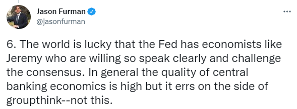“使用通胀预期来解释观察到的通胀动态是不必要且不可靠的,”他写道。“援引预期渠道没有令人信服的理论或经验依据,可能导致严重的政策错误。”