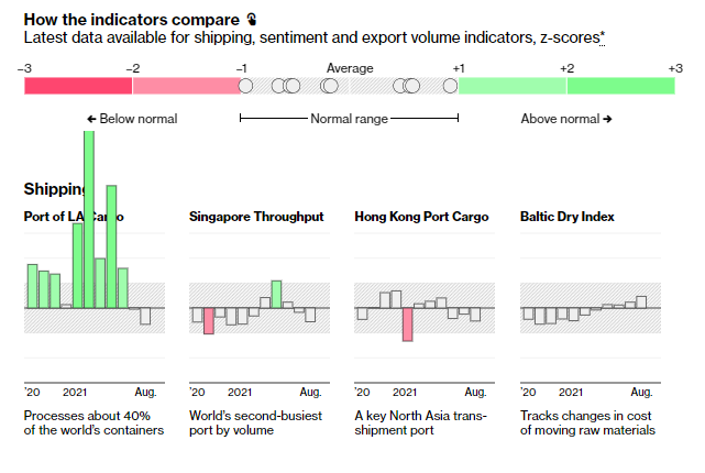 德尔塔变种对全球供应链的打击似乎在减弱,但彭博贸易追踪器表明已经造成了一些持久性损害。9月最后一周,追踪器的10个指标都处于正常范围,而两个月前,几乎一半指标还处于“高于正常”的范围。韩国的出货量仍然强劲,与中国制造业疲软和半导体供应链困境形成对比,这些困境正在限制订单。尽管台湾8月出口在强劲的电子需求中保持增长势头,但是几乎一年来最疲弱,政府并不指望本月有太大改善。