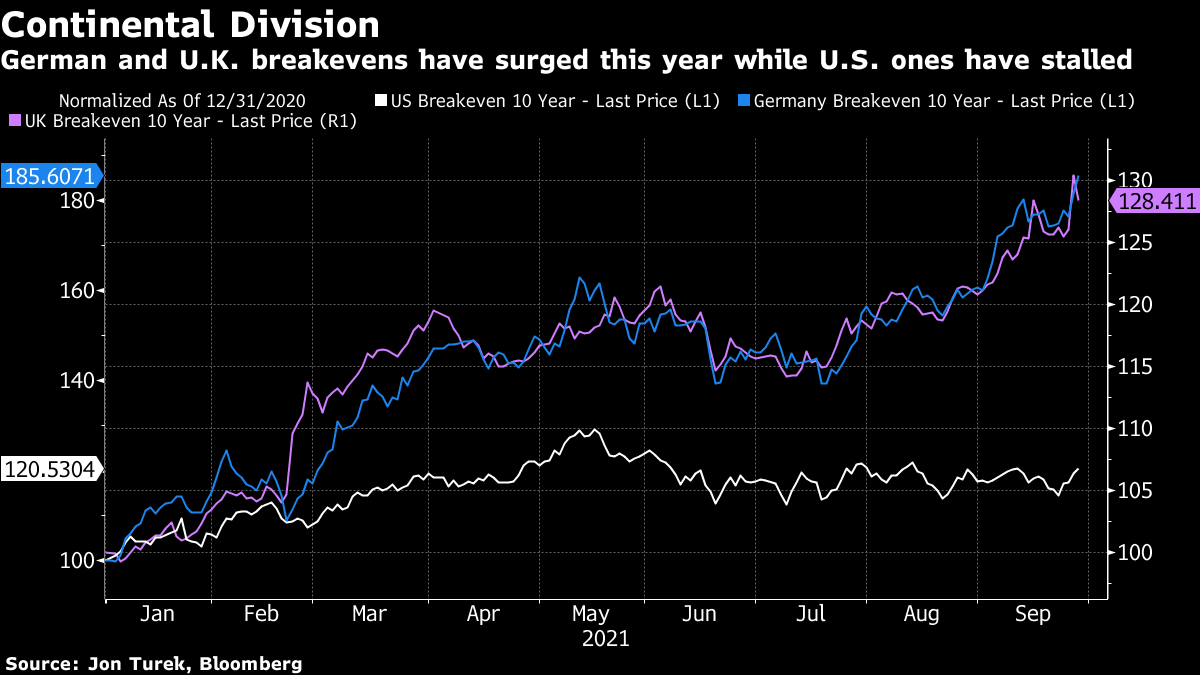 但另一方面,你也可以把债券收益率上涨看作是欧洲正在发生的事情的一个结果,最近几天欧洲发生了一场极其嘈杂的能源危机和德国大选。Cheap Convexity的Jon Turek指出,随着能源价格上涨,英国和欧洲的通胀预期已经飙升,而美国的通胀预期保持相对稳定,这表明市场并没有真正担心美国的通胀问题。与此同时,Tallbacken Capital Advisors的Michael Purves认为,最近几天美国国债、英国国债和德国国债之间的短期相关性已经达到历史上不寻常的水平,这表明技术因素正在发挥作用。