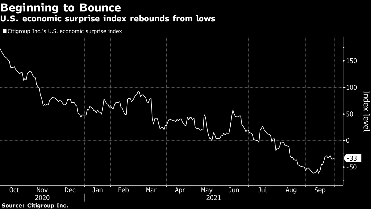 在美国,新病例数量在9月份减少了三分之一,从9月1日的七天平均超过161,000例降至周二的约107,000例,根据疾病控制和预防中心的数据。花旗集团的经济意外指数--衡量报告超出或低于预测的幅度--已经开始反弹。
