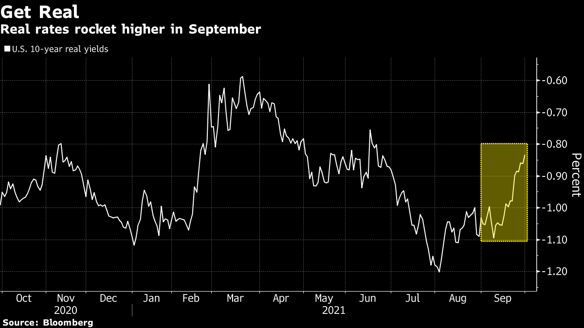 观察名义国债收益率已经足够有趣,但通常情况下,真正的行动发生在幕后。所谓的实际利率——国债通胀保护证券的收益率,剔除了价格压力的影响——一直在迅速上涨。尽管仍然严重负值,但10年期实际利率在9月份大约上涨了14个基点,延续了8月份近15个基点的涨幅。
